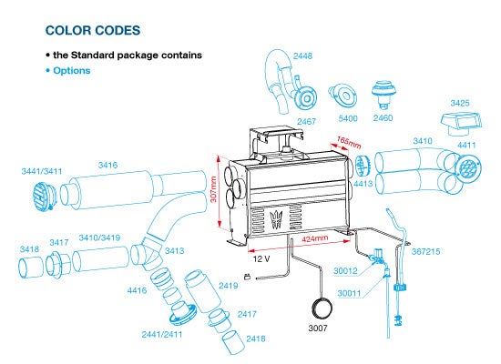 Lämmityspaketti sisältää: lämmittimen, ohjauspaneelin, kiinnitystelineen, 4 m polttoaineletkun, dieselsuodattimen, 4 m virtakaapelin sekä sulakepitimen sulakkeella.